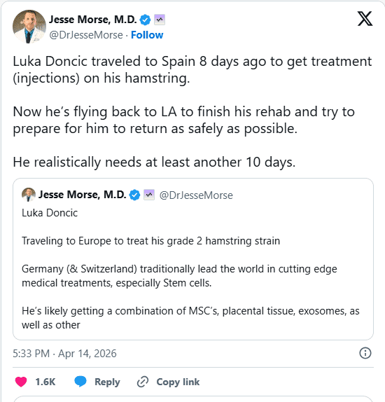 According to medical analysis, Dončić underwent multiple injection-based treatments aimed at accelerating healing in his hamstring.