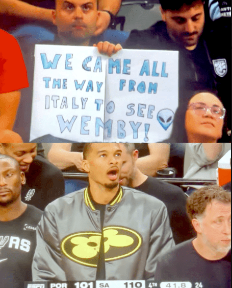During the broadcast, cameras captured the fan holding a sign that read: “We came all the way from Italy to see Wemby!” The moment instantly went viral.