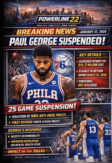 The Philadelphia 76ers’ playoff push suffered a massive blow Saturday with the NBA announcing a 25-game suspension for star wing Paul George. The league’s punishment, for a violation of its anti-drug policy, strips the Eastern Conference contender of a key starter for nearly two months.