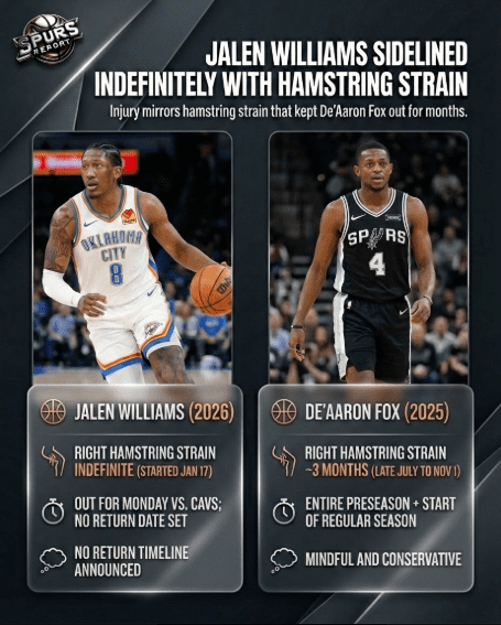 The Thunder have not announced a specific timeline for Williams’ return, with reports indicating he is out “indefinitely”.