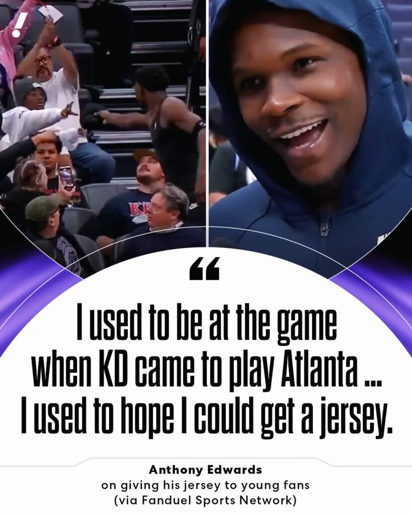 Anthony Edwards’ story shows the lasting influence of Kevin Durant. Watching KD play in Atlanta, Edwards learned lessons that went far beyond basketball skills. Durant’s work ethic, poise under pressure, and ability to inspire others left an imprint on Edwards. Now, years later, he has the chance to pass that inspiration forward in the most literal way handing a piece of himself, a jersey, to a fan who looks up to him just like Edwards once looked up to KD.