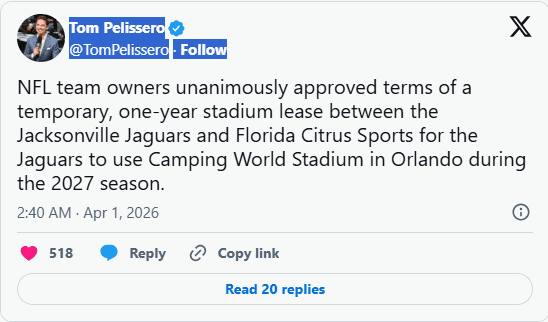 According to a new report from NFL Network’s Tom Pelissero, the Jaguars have received league approval to relocate temporarily for the 2027 NFL season.