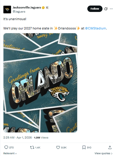 This temporary move places the Jaguars in a city already buzzing with sports energy. Orlando is home to the NBA’s Magic, MLS’ Orlando City, and the NWSL’s Orlando Pride.
