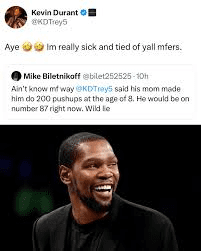 It all started when a user named @bilet252525 mocked Durant for saying that his mom once made him do 200 pushups a day as an 8-year-old. The fan joked:
