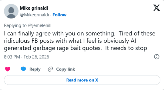 “I can finally agree with you on something. Tired of these ridiculous FB posts with what I feel is obviously AI generated garbage rage bait quotes. It needs to stop,” said another.