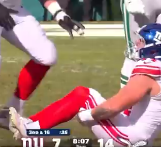 “Carted off in an air cast a nightmare moment for the Giants’ breakout rookie.”
