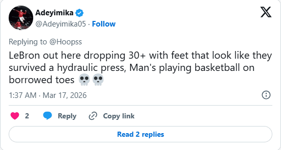 “LeBron out here dropping 30+ with feet that look like they survived a hydraulic press, Man’s playing basketball on borrowed toes 💀💀,” one fan joked.