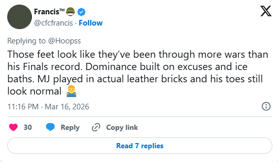 “Those feet look like they’ve been through more wars than his Finals record. Dominance built on excuses and ice baths. MJ played in actual leather bricks and his toes still look normal 🤷♂️,” another claimed.