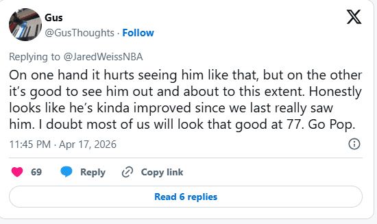 Fans quickly reacted online, with emotions ranging from heartbreak to cautious optimism.Some viewers expressed sadness at seeing Popovich in a more fragile state, noting how difficult it was to watch a figure once known for his commanding presence now moving more carefully.
