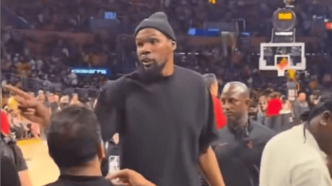 Although sidelined due to a knee issue sustained in practice, Durant still managed to become one of the most talked-about figures of the night this time for his heated exchange with a fan.