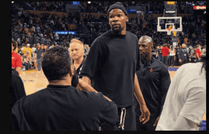 Seated courtside, Durant appeared visibly engaged in the game despite being unable to play. However, things quickly escalated when a Lakers fan directed comments toward him.