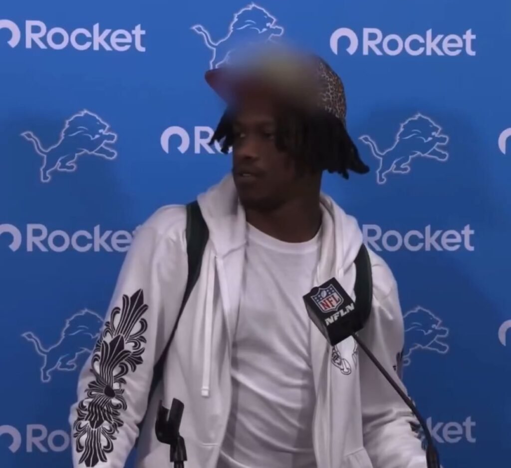 The Detroit Lions had just wrapped up their game, and the locker room was buzzing with energy. Cameras were rolling, players smiling, the kind of relief that only comes after a good performance. Jameson Williams, one of the team’s most promising young wide receivers, made his way to the podium for the usual postgame chat. He looked calm, happy, and confident the way an athlete should after doing his job right. But within seconds of the Lions posting the video of that press conference, fans started noticing something strange.