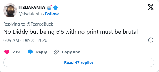 “No Diddy but being 6’6 with no print must be brutal,” one fan commented, sparking a thread of jokes about Ball’s… lack of visible assets.