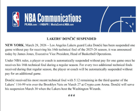 On Saturday evening, the NBA announced that Doncic has been suspended one game for picking up his 16th technical foul of the season.
