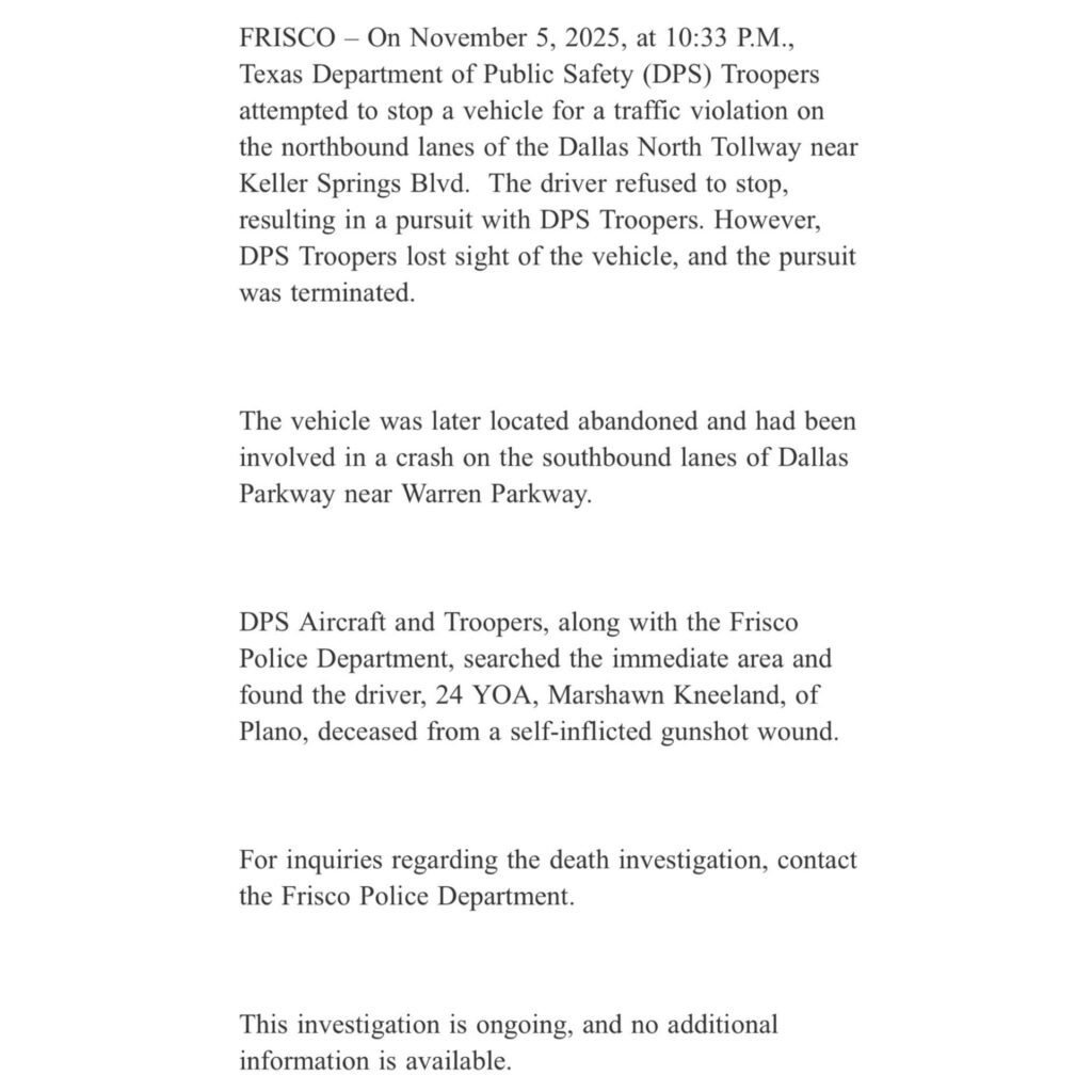 According to the Texas Department of Public Safety, Kneeland was involved in a *traffic stop in Frisco, Texas, following a minor moving violation. The situation quickly escalated into a chase, during which police eventually lost sight of his vehicle.