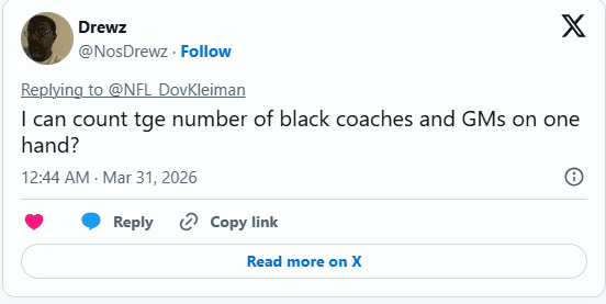 “I can count the number of black coaches and GMs on one hand?” one fan asked.