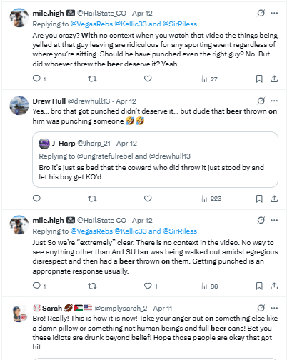 Despite the initial confrontation, the targeted fan eventually chose to walk away with his companion. However, the situation didn’t end there, as he appeared to be struck again possibly with food while exiting the area.