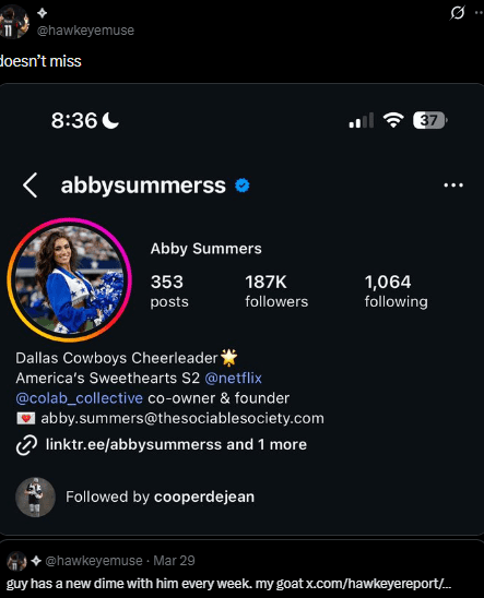 According to fans on X, the woman photographed with DeJean has been identified as Abby Summers, a Dallas Cowboys cheerleader. The revelation sparked instant reactions, especially from Cowboys fans who were stunned to see one of their own linked to a rising star from their NFC East rivals.