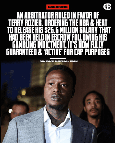 Terry Rozier has won his arbitration case against the NBA and the Miami Heat, forcing the release of his $26.6 million salary that had been frozen