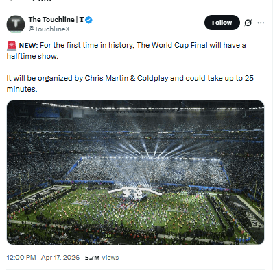 According to reports, Coldplay frontman Chris Martin will help organize the show, marking a major shift in how FIFA approaches the sport’s biggest stage.