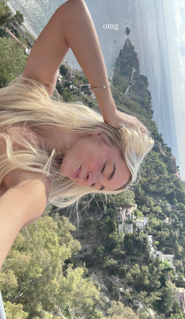 Attached was an Instagram Story screenshot. The former LSU gymnast and Sports Illustrated model, on a romantic Italian getaway with MLB star boyfriend Paul Skenes, lay in a relaxed pose, one hand behind her head, smiling serenely at the camera. The lush greenery and water of Taormina, Sicily framed her. And scrawled across the image in her own handwriting was a simple, perfect caption: “Omg.”