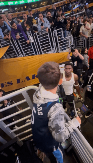 The scene is a familiar post-game ritual of generosity and chaos. Players, sweat still drying, make their way toward the tunnel, surrounded by a sea of outstretched hands, hopeful faces, and pleading voices. In this controlled frenzy, Anthony Edwards spotted a young fan, a kid whose eyes held that specific mix of awe and desperate hope.