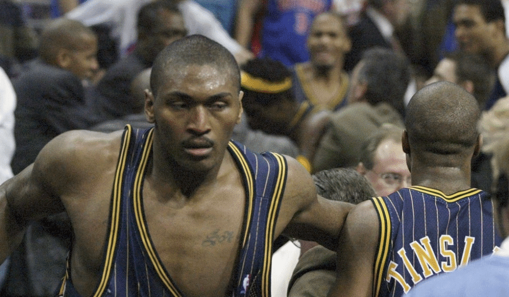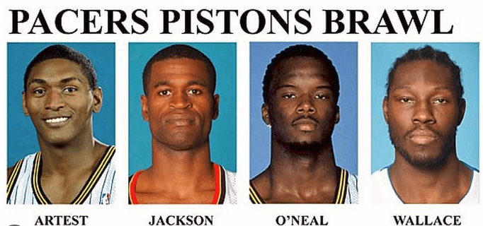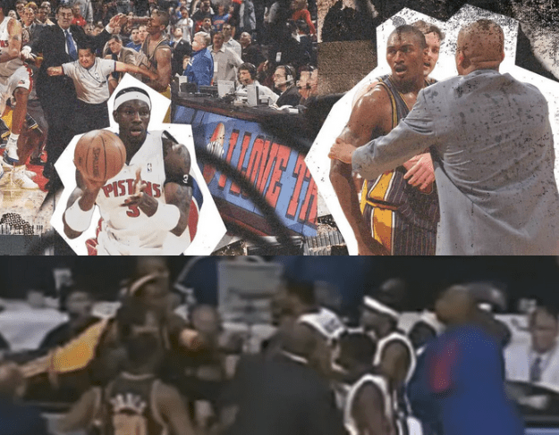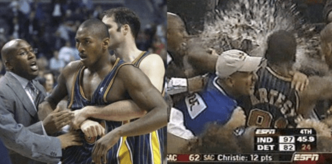 The images from that night Artest brawling in the stands, Jermaine O’Neal’s sliding punch on a fan who stormed the court, and popcorn and drinks raining down on the Pacers spread like wildfire. Commentators sat in stunned disbelief, calling it one of the darkest moments the NBA had ever seen.