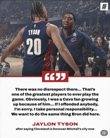 “There was no disrespect there,” Tyson stated. “Bron is one of the greatest players to ever play the game. I was a Cavs fan growing up because of him. If I offended anyone, I’m sorry. I take personal responsibility.”
